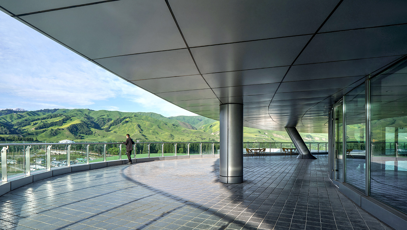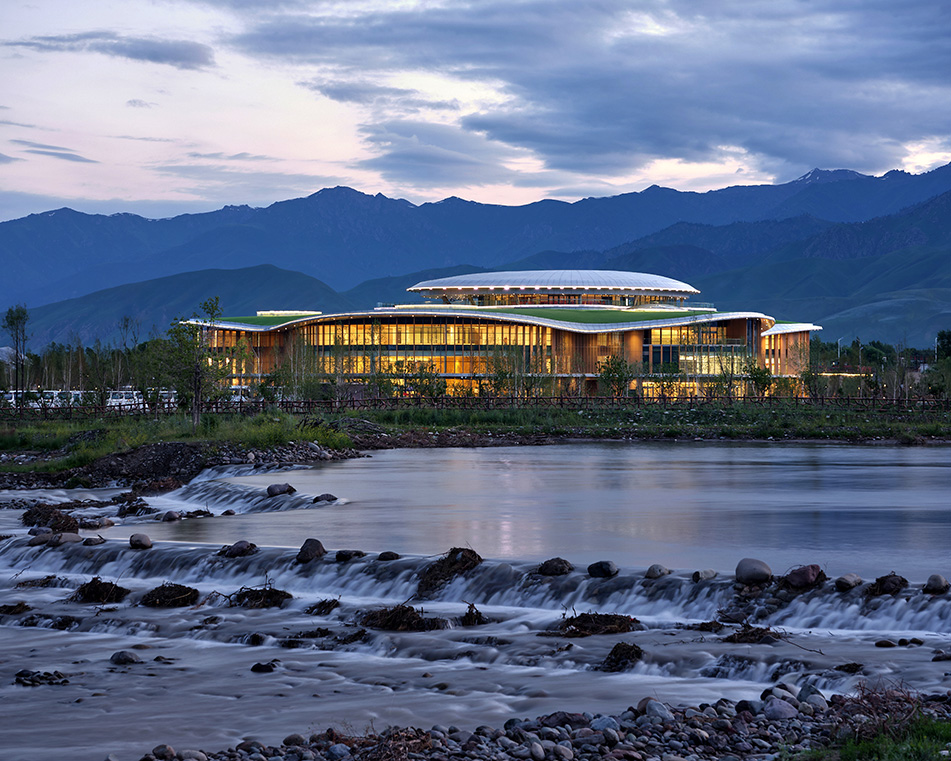 建筑的主體則覆蓋于這片起伏的花瓣狀屋面之下。屋頂的起伏同時也塑造了室內的空間變化——時而高聳,時而低落,使得空間產生了新的“機會”。靈活設置的室內空間也配合著屋頂的起伏,呈現出賦予張力的戲劇化體驗,同時人在建筑中也能獲得多樣的觀景視點。四季變幻的河谷草原風光,透過落地的幕墻傾瀉而入室內,置身其中能真切感受到大自然的生動和遼闊。