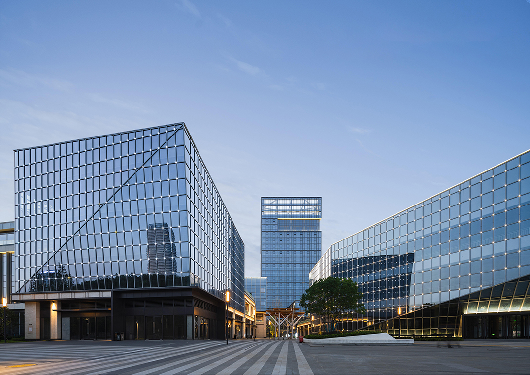 高樓塑造連續統一的城市界面,多層研發樓形成獨立安靜的工作空間。園區由南至北高度疊級,對城市與景觀相呼應,整個園區布局由南至北,高度疊級,與四周城市景觀銜接,區域交融共同生長。多層研發,采用延續的幕墻,界面簡潔,局部的高透玻璃,形象上與生產區分。沿街除主入口外,便是生產獨棟,由清晰的體塊進退關系,打造現代生產空間,作為園區占地最大的部分,憑借清晰的形體進退,有序的界面,虛實相映的立面設計成為園區的一張名片。沿綜合生產樓內側設置下沉廣場,形成一個安靜的庭院,不僅滿足地下功能空間采光通風的需求,下沉式的設計也增加了園區空間的層次感。