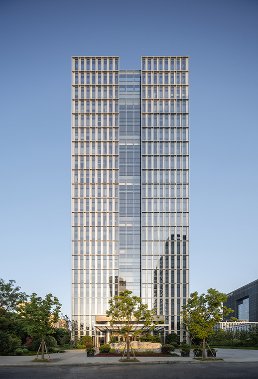設計將塔樓置于場地東南角,緊鄰主干道鐘園路,契合整體城市空間形態,對周邊區域的城市界面起到織補作用,同時凸顯了自身的建筑特征。裙房與塔樓在形態上相互咬合,用地集約,既滿足了不同功能的使用需求,又形成簡潔挺拔的建筑體量。建筑形態通過立面重復元素來塑造韻律感,單元式幕墻將線與面相互結合,實與虛形成對比,運用鋁板與玻璃的材質,并內嵌燈槽勾勒輪廓來呈現表皮肌理。