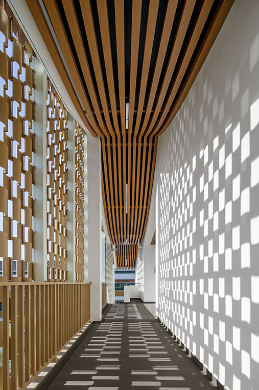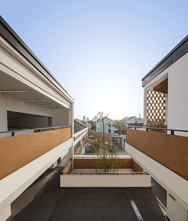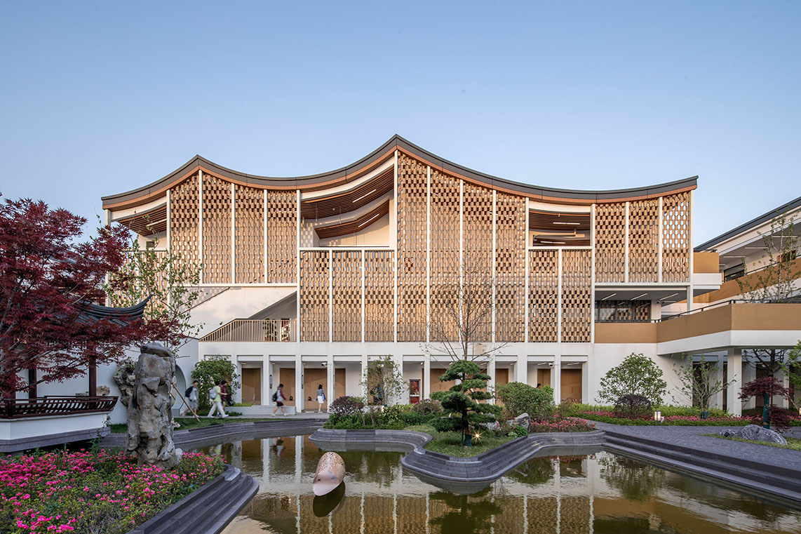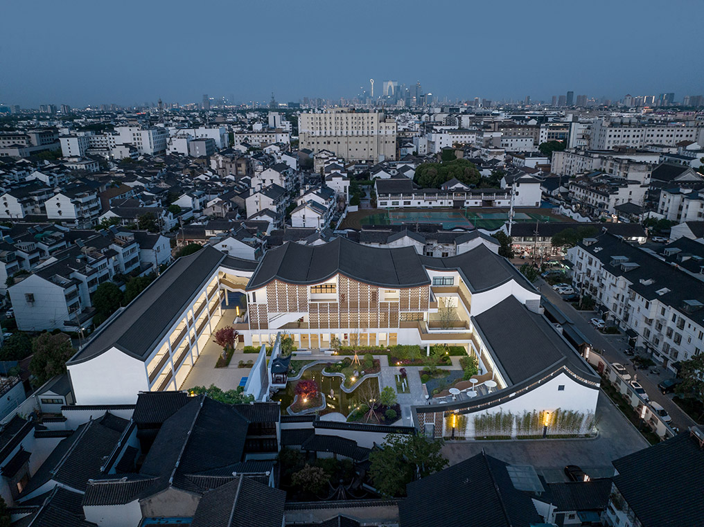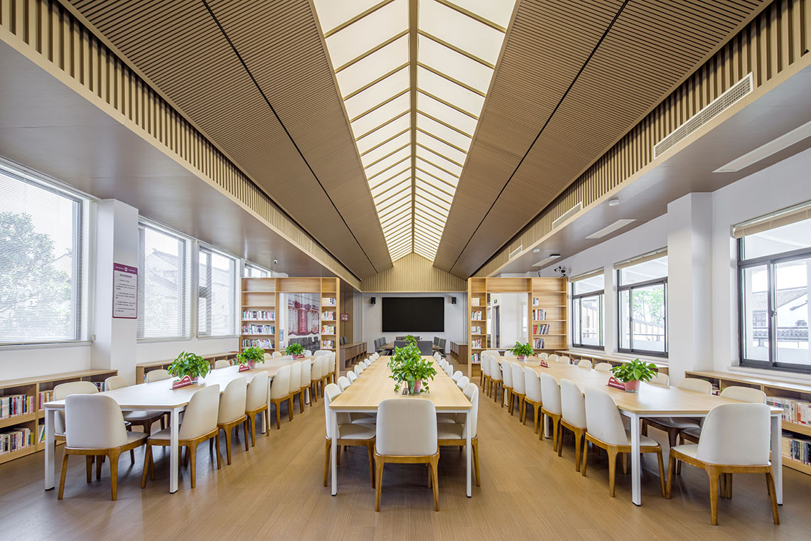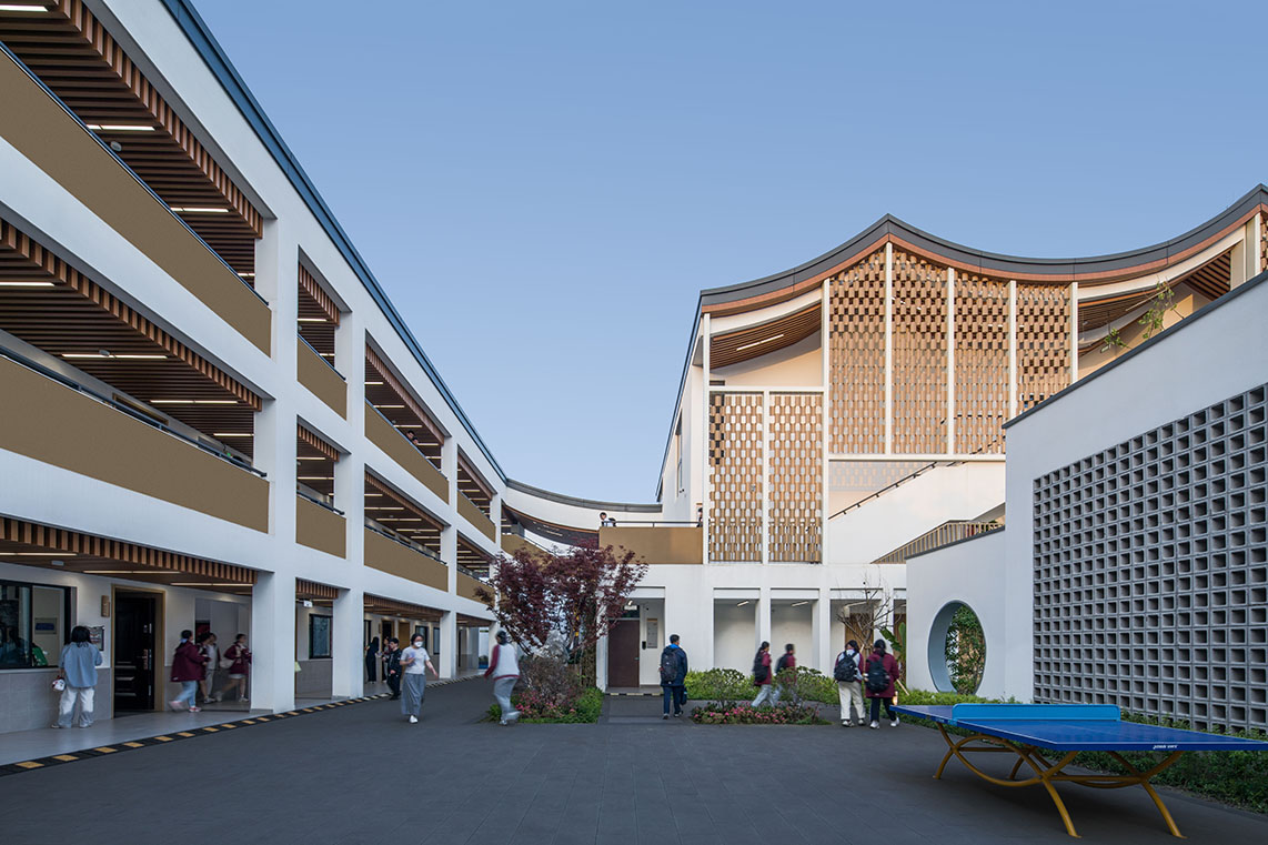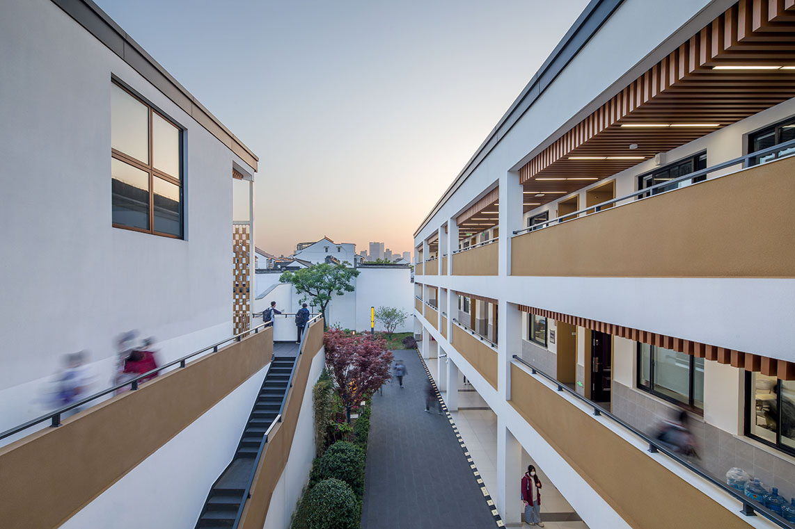 項(xiàng)目秉承“傳承與創(chuàng)新”的理念,在尊重古城風(fēng)貌和保護(hù)周邊控保建筑的前提下,探索新中式學(xué)校建筑風(fēng)格。設(shè)計(jì)通過(guò)對(duì)地下空間的利用、相同尺度空間的疊合、立面手法削弱大體量空間尺度感等方式,合理巧妙的把新校區(qū)大尺度功能空間與古城區(qū)小尺度街坊融合在一起,彼此間并不突兀。建筑通過(guò)圍合的方式在場(chǎng)地內(nèi)部留出一處內(nèi)院,與控保建筑隔墻呼應(yīng),結(jié)合古城風(fēng)貌特色打造校園文化園林,讓新建學(xué)校與古城街坊融為一體,打造功能完善、環(huán)境優(yōu)美的現(xiàn)代化校園。