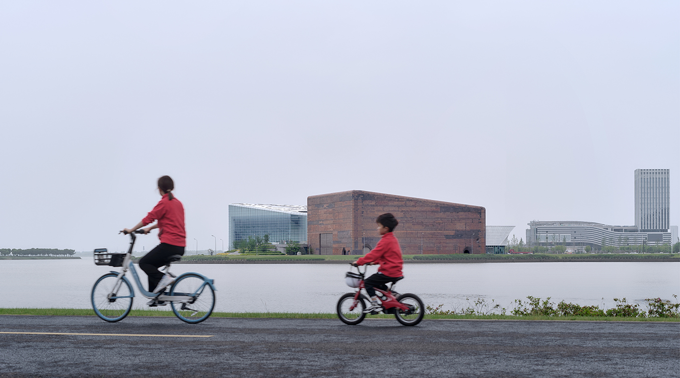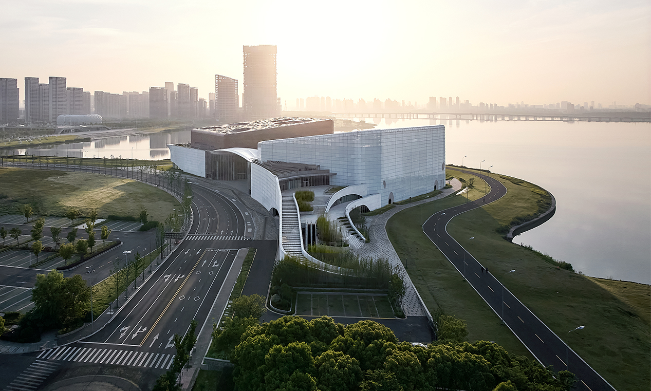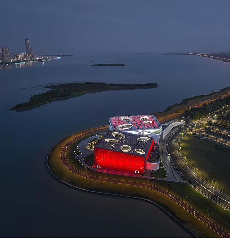 橙天嘉禾360劇場項目地處吳中太湖新城核心區,項目建成后成為太湖周邊重要的文化標志性建筑。設計采用“湖畔礫石”的理念,坐落在湖邊的建筑宛如自然環境中生長出來的石頭,坡地景觀的柔美自由和兩塊礫石的硬朗干脆形成鮮明對比,突顯了本項目與太湖文化及生態環境協調一致的理念。