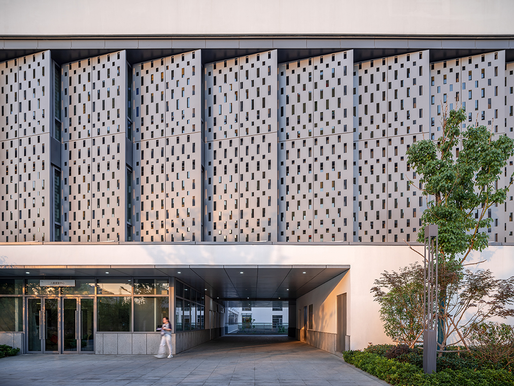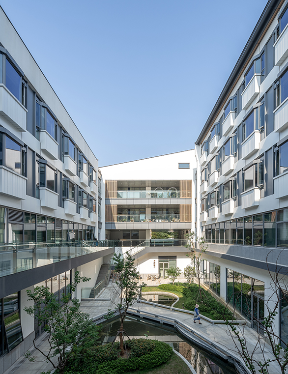 建筑整體上呈兩個(gè)高低體量并行布置,滿足規(guī)劃限制高度,布局順應(yīng)地形伸展開來,使病房更易獲得最佳日照,擁有最開闊的護(hù)城河景觀視野,同時(shí)形成中軸對(duì)稱的建筑形態(tài)。建筑從蘇州傳統(tǒng)建筑中提取靈感,并結(jié)合現(xiàn)代的處理方式將其優(yōu)化,蘇式韻味藏于建筑的意形之間,與古城風(fēng)貌和諧相融。