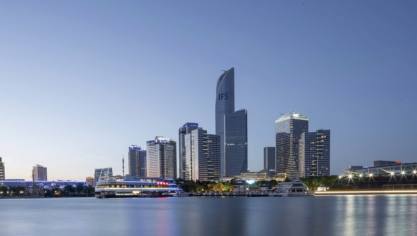 項目位于金雞湖畔,主體為四棟塔樓,基地被 30m 寬的南北向號觀大道分隔,四棟塔樓分置四角。為獲得最大的景觀朝向,塔樓朝向扭轉了一定角度,從而能夠最大化利用金雞湖的開闊視野,也為基地預留了發展空間。其中兩棟塔樓通過底部大型商業裙房相連,打造為整個地塊的商業中心。商業、辦公區域均有獨立的出入口,互不干擾又方便聯系。結合底層局部架空和外觀造型的設計,使高大的建筑與城市有機地結合在一起,保持了城市整體空間環境的協調,通過屋面綠化和對設備的屋面格柵進行設計,達到凈化城市第五立面的效果。