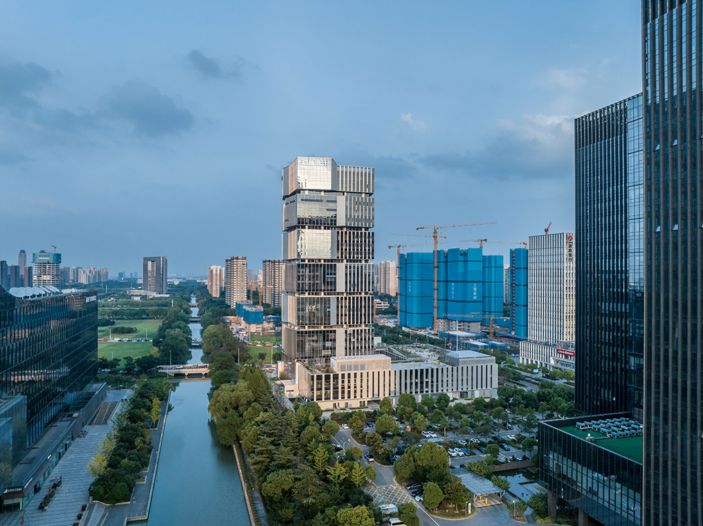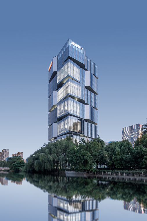 新大樓位于蘇州工業園區湖東 CBD,基地北側緊鄰蘇州現代傳媒大廈,從兩座建筑之間的中央河向西望去,正是蘇州工業園區最重要的地標——東方之門。在這樣一個重要的區位,新大樓不僅要兼顧與周邊城市環境的協調和企業形象的塑造,還要體現傳統的蘇州意象。
